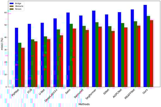 Quantitative analysis. Table 1 presents the comparison results using the proposed method and other baseline methods. Our model achieves state-of-the-art (SOTA) segmentation accuracy in terms of mIoU and F1 score metrics, significantly outperforming the classical segmentation baseline method, DeepLabv3+, by 6.47% in mIoU. Compared to traditional visual segmentation approaches, infrared-specific segmentation baseline models show superior performance against challenging nighttime scenarios. For each class of segmentation accuracy, targets with small quantities—such as bridges, obstacles, and persons—exhibit low segmentation accuracy, while large-scale targets like sky, water, and background display high segmentation accuracy across all baseline models. Figure 9 illustrates the comparison results of segmentation accuracy (mIoU) for classes with small amounts. From these comparison results, it is evident that the proposed method significantly improves segmentation accuracy in these classes with small amounts. This improvement is primarily due to the cross-granularity fusion strategy, which enables better feature representation for minority classes. Additionally, our model’s use of HOG features helps to capture contour information at various scales, enhancing performance in complex scenes. Compared to baseline methods, the proposed approach demonstrates robustness in distinguishing small targets from surrounding environments. Overall, these results highlight the model’s effectiveness in handling both large-scale and minority classes under challenging infrared conditions.