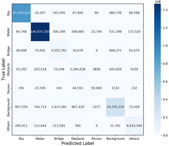 Confusion matrix analysis. Figure 10 illustrates a confusion matrix presenting different classes using our method. The results show high classification accuracy for dominant classes like sky and water. However, there is some misclassification, particularly between sky and background, and between obstacles and other objects, reflecting the challenging nature of distinguishing fine details in such complex scenes. This could be due to similar visual characteristics in certain parts of these classes, especially under varying lighting or atmospheric conditions. The model also confuses “Obstacle” and “Bridge” objects. Since both can be similar in structure and position in the image, the model might require further training on more specific features to improve its discrimination between these classes. The matrix also indicates that smaller classes, such as “person” and “others”, have more confusion with larger classes, such as background, due to their relatively lower representation in the dataset. This suggests room for improvement in handling minority classes and refining edge cases.