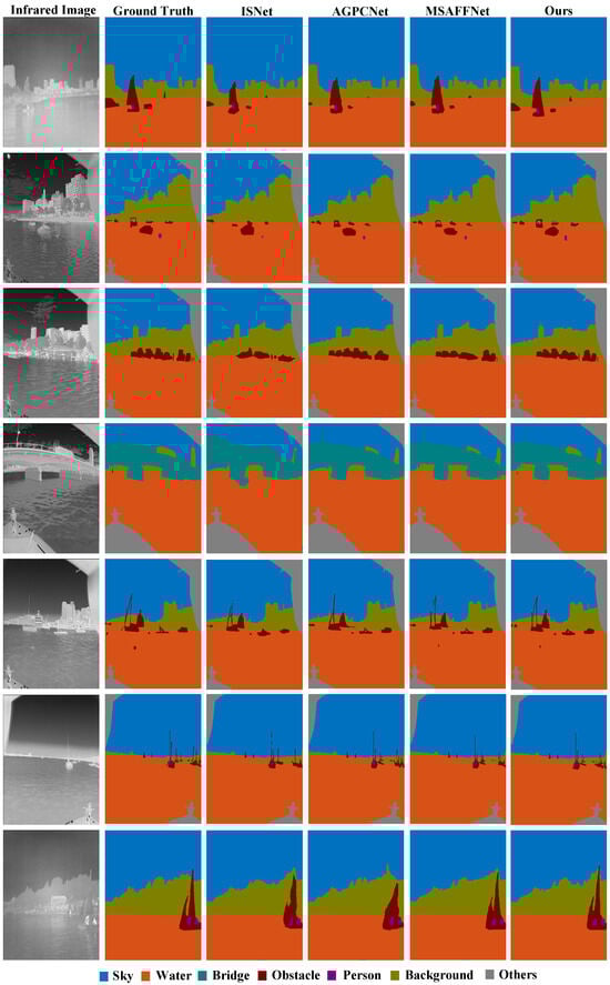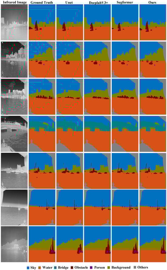 Visualization analysis. Figure 11 and Figure 12 show visualization comparisons of segmentation results. The visualization results clearly demonstrate the superior performance of our method compared to other general semantic segmentation methods like U-Net, DeepLabv3+, and SegFormer. Our method produces more accurate and detailed segmentations, particularly in complex regions such as water reflections and small obstacles. While U-Net and DeepLabv3+ struggle with distinguishing fine-grained features in low-contrast areas, our method effectively captures these details, leading to smoother and more precise boundary delineations. SegFormer, though advanced, tends to lose accuracy in smaller object detection and edge preservation, areas where our approach excels, showcasing enhanced segmentation consistency across challenging maritime scenes. While ISNet and AGPCNet perform well in standard scenarios, they tend to struggle with accurately segmenting small objects and regions with low contrast, such as distant obstacles on the water surface. MSAFFNet, though effective in capturing global context, shows limitations in preserving fine details and boundary clarity. In contrast, our method excels in both global context understanding and edge preservation, producing sharper and more coherent segmentations, particularly in complex infrared marine scenes with noise and varying environmental conditions.