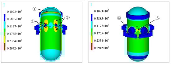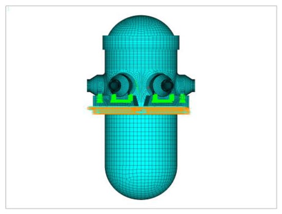 (2) Simplify the structural model to include only the RPV structure. Fix the base of the RPV supports. Since the RPV has six degrees of freedom of acceleration at each frequency, calculate the composite acceleration amplitude based on each acceleration value and the phase corresponding to its maximum amplitude. Apply the global acceleration and perform finite element analysis, as shown in Figure 8.