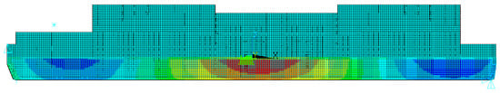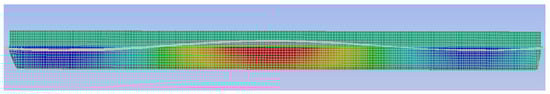 (2) Map the wave load onto the wetted surface of the hull and apply simply supported constraints at the bow and stern in accordance with the DNV specifications [22], as shown in Figure 5. Conduct finite element analysis to obtain the RPV fatigue stress under regular waves at each frequency.