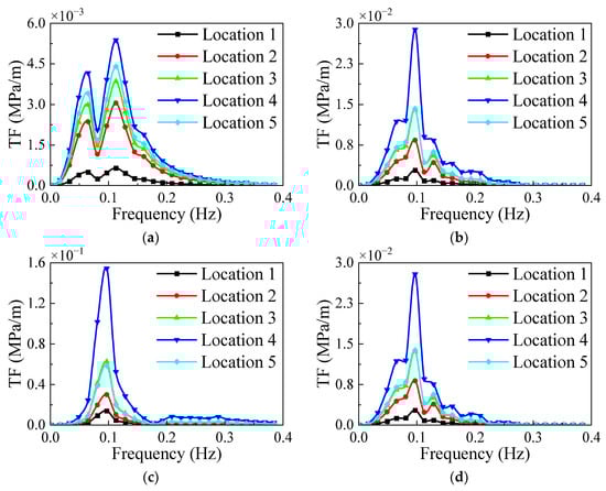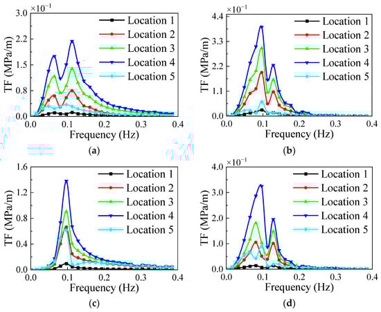 Transfer function from wave pressure to structural stress: (a) 0° wave direction; (b) 45° wave direction; (c) 90° wave direction; (d) 135° wave direction.