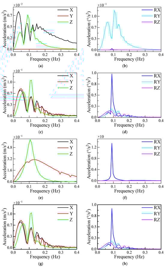 Acceleration amplitude spectrum: (a) 0° wave direction, surge, sway, and heave acceleration; (b) 0° wave direction, roll, pitch, and yaw acceleration; (c) 45° wave direction, surge, sway, and heave acceleration; (d) 45° wave direction, roll, pitch, and yaw acceleration; (e) 90° wave direction, surge, sway, and heave acceleration; (f) 90° wave direction, roll, pitch, and yaw acceleration; (g) 135° wave direction, surge, sway, and heave acceleration; (h) 135° wave direction, roll, pitch, and yaw acceleration.