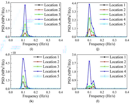 Stress PSD of the structure under typical sea conditions: (a) 0° wave direction, Hs = 3.5 m, Tp = 7 s; (b) 45° wave direction, Hs = 3.5 m, Tp = 7 s; (c) 90° wave direction, Hs = 3.5 m, Tp = 7 s; (d) 135° wave direction, Hs = 3.5 m, Tp = 7 s; (e) 0° wave direction, Hs = 4.5 m, Tp = 8 s; (f) 45° wave direction, Hs = 4.5 m, Tp = 8 s; (g) 90° wave direction, Hs = 4.5 m, Tp = 8 s; (h) 135° wave direction, Hs = 4.5 m, Tp = 8 s; (i) 0° wave direction, Hs = 5 m, Tp = 9 s; (j) 45° wave direction, Hs = 5 m, Tp = 9 s; (k) 90° wave direction, Hs = 5 m, Tp = 9 s; (l) 135° wave direction, Hs = 5 m, Tp = 9 s.