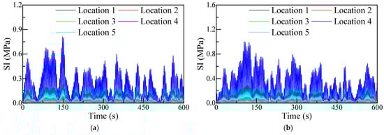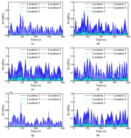 First, the quasi-time-domain method was used to calculate structural fatigue damage. The JONSWAP wave spectrum was used, and the stress PSD of the structure was calculated according to Equation (4), as shown in Figure 10.