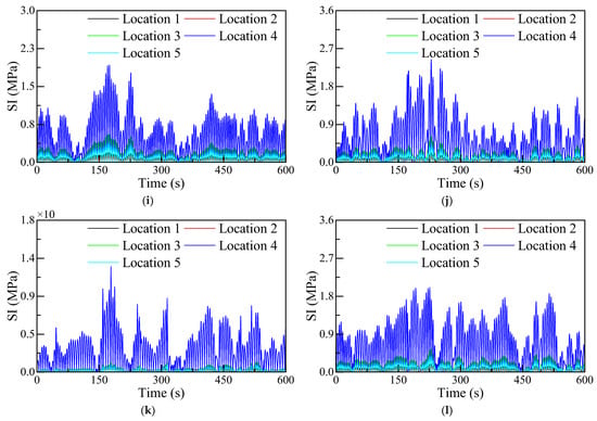 Stress time history from time-domain analysis: (a) 0° wave direction, Hs = 3.5 m, Tp = 7 s; (b) 45° wave direction, Hs = 3.5 m, Tp = 7 s; (c) 90° wave direction, Hs = 3.5 m, Tp = 7 s; (d) 135° wave direction, Hs = 3.5 m, Tp = 7 s; (e) 0° wave direction, Hs = 4.5 m, Tp = 8 s; (f) 45° wave direction, Hs = 4.5 m, Tp = 8 s; (g) 90° wave direction, Hs = 4.5 m, Tp = 8s; (h) 135° wave direction, Hs = 4.5 m, Tp = 8 s; (i) 0° wave direction, Hs = 5 m, Tp = 9 s; (j) 45° wave direction, Hs = 5 m, Tp = 9 s; (k) 90° wave direction, Hs = 5 m, Tp = 9 s; (l) 135° wave direction, Hs = 5 m, Tp = 9 s.