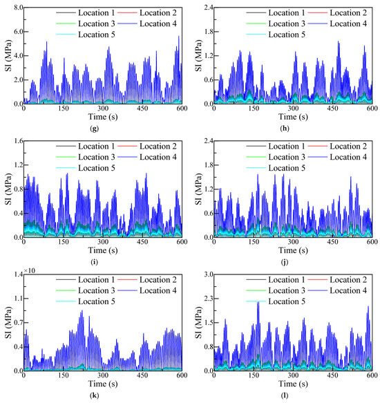 Fatigue stress time history generated by frequency-time transformation: (a) 0° wave direction, Hs = 3.5 m, Tp = 7 s; (b) 45° wave direction, Hs = 3.5 m, Tp = 7 s; (c) 90° wave direction, Hs = 3.5 m, Tp = 7 s; (d) 135° wave direction, Hs = 3.5 m, Tp = 7 s; (e) 0° wave direction, Hs = 4.5 m, Tp = 8 s; (f) 45° wave direction, Hs = 4.5 m, Tp = 8 s; (g) 90° wave direction, Hs = 4.5 m, Tp = 8 s; (h) 135° wave direction, Hs = 4.5 m, Tp = 8 s; (i) 0° wave direction, Hs = 5 m, Tp = 9 s; (j) 45° wave direction, Hs = 5 m, Tp = 9 s; (k) 90° wave direction, Hs = 5 m, Tp = 9 s; (l) 135° wave direction, Hs = 5 m, Tp = 9 s.
