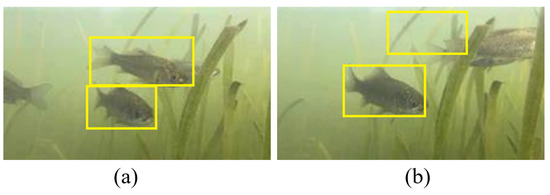 (a,b) Object tracking failure due to water weed occlusion. The yellow boxes denote the fish tracking results.