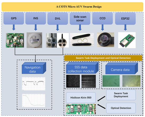 In this section, we present our design for a low-cost micro-AUV system. This includes an overview of the mechanical, electronic, and control architecture. The proposed AUV is characterized by its compact size, simplicity, and affordability while offering a range of essential functionalities such as autonomous navigation, object detection, and object tracking. As a result, it can be easily integrated into various projects for intelligent systems and applications. Similar to a conventional AUV, our micro-AUV comprises the following key modules: a water-resistant shell, a navigation and control module, a communication module, an energy management module, a propulsion module, and an external payload interface module, which can accommodate various accessories like side-scan sonar (SSS) and the Doppler Velocity Log (DVL). Supported by all the above-mentioned modules, the micro-AUV design structure is presented in Figure 2.