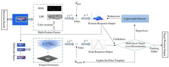 Several tracking systems have benefited from these enhancements. For instance, Li et al. proposed a real-time fish tracking method based on novel adaptive multi-appearance models and tracking strategies. To address the issue of target occlusion, Ref. [12] designed an improved KCF tracker, which incorporates a self-discrimination mechanism based on the uncertainty of system confidence. Ref. [38] proposed an improved anti-occlusion object tracking algorithm using an unscented Rauch–Tung–Striebel smoother and kernel correlation filter. Ref. [39] added a fusion correction mechanism (FCM) to the KCF tracking algorithm to improve tracking performance. Ref. [40] explored real-time object tracking methods applied to underwater robotics platforms. Additionally, they evaluated color restoration algorithms suitable for enhancing the quality of images. Ref. [41] presented a multiple-fish tracking system for low-contrast and low-frame-rate stereo videos. Ref. [15] proposed a novel tracking algorithm based on the deformable multiple kernels. Furthermore, there are some TLD-based trackers and particle-filter-based trackers. Rout et al. designed Walsh–Hadamard-kernel-based features in a particle filter framework for underwater object tracking [42]. Ref. [43] proposed multi-feature fusion in a particle filter framework for visual tracking. Ref. [44] designed UOSTrack for marine organism grasping. Ref. [13] designed a hybrid excitation model-based lightweight Siamese network. However, most of the aforementioned methods overlook the spatial restriction issue in correlation filters and lack the re-detection capability to refine unreliable tracking results. They also lack a discriminative mechanism and adaptive template updating; template updating is indispensable when the underwater target is undergoing rapid movement and deformation.