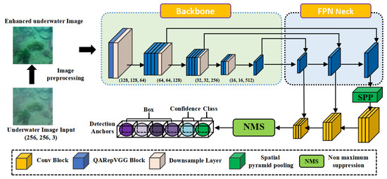 Figure 5 presents the overall architecture of the lightweight underwater object detection model. In the backbone of our model, we employ six QARepVGG blocks and four downsampling layers to extract features from underwater images. These extracted features are then fed into Spatial Pyramid Pooling (SPP) and Feature Pyramid Network (FPN) modules, which enable a larger receptive field and facilitate global context linkage. This approach helps mitigate the impact of water reflections and enhances the model’s robustness. Furthermore, the detection results are generated through a detection head based on an anchor-free detection scheme. Unlike the traditional YOLO series object detectors that use an anchor-based detection scheme, which can introduce complexity in embedded computing applications, the anchor-free detection scheme has gained popularity due to its strong generalization capability and faster decoder speed. Therefore, we adopted the anchor-free detection scheme in the detection head to optimize performance.