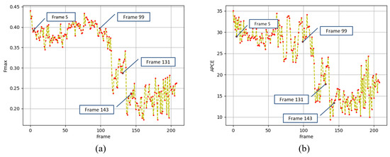 - After the target is lost, the correlation filter tracker introduces background error information, treating the background as the target and continuing tracking, leading to a lower value. In the 143th frame, Fmax = 0.237 and APCE = 13.34.