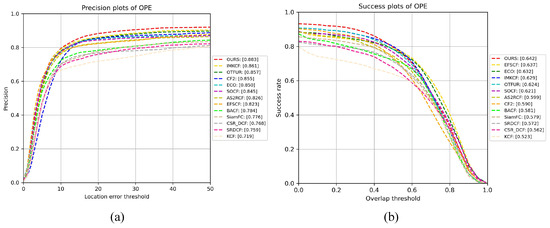 (a) OPE precision plots for the underwater visual data. (b) OPE success rate plots for the underwater visual data.