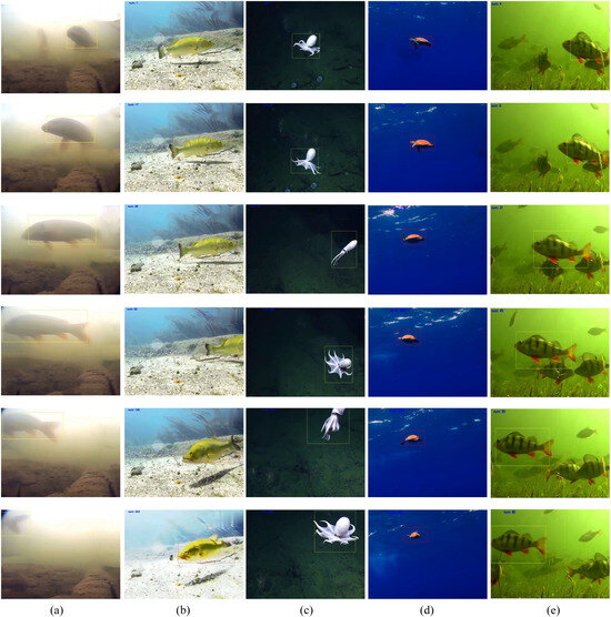 The visualization perception results of our proposed model in various scenes; the box denotes the tracked marine organisms. (a) Example of low-light challenge (fish 1). (b) Example of fast motion challenge (fish 2). (c) Example of the motion deformation challenge (octopus). (d) Example of the challenge in target size (turtle). (e) Example of complex scene, including several potential tracking objects (fish 3). The boxes denote the fish tracking results.