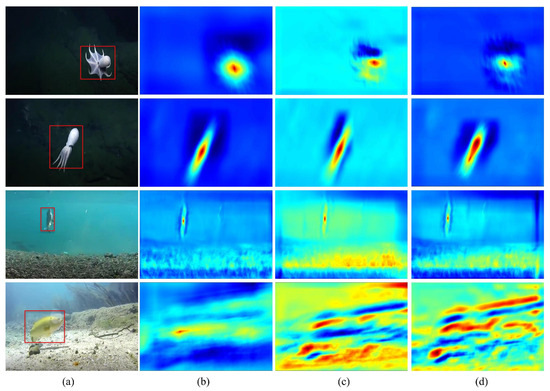 Examples of feature visualization on the different sequences. The red box is the ground truth of the target. (a) Underwater image and ground truth. (b) Ours. (c) EFSCF. (d) AS2RCF. The red areas represent high correlations.