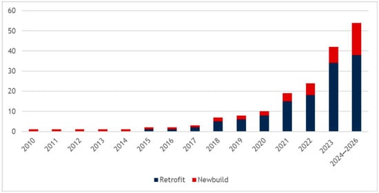 There are six different categories of wind-assisted propulsion technologies. These include rotor sails, hard sails, suction wings, kites and soft sails (traditional fabric sails that have been adapted for modern ships) [2,4,5]. According to [2], as of mid-2023, WAPS have been installed on 30 vessels, with an additional 26 ships either in the process of installation or scheduled for future installation. The trend is shown in Figure 1. Of these, 16 are newbuilds, while 38 existing ships are undergoing retrofitting (no data are available for two installations). In the WAPS review in [6], from 2021, it was concluded that, although the current adoptions present only a small percentage of the total fleet, research consistently shows that WAPS have the potential to make ships more energy efficient (rotors: 0.4–50%; kites: 1–50%; rigid sails: 5–60%; soft sails: 4.2–35%; wind turbines: 1–4%). Similar values have been confirmed in more recent (2022–2024) studies in [2,7,8,9,10].