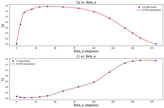 The coefficients Cr and Cp are defined as a function of the sail shape and the angle of attack. Figure 2 shows the aerodynamic coefficients used in this case study, obtained from [39]. The curves were fitted into the code using the piecewise cubic hermite interpolating polynomial (PCHIP) method. For each change in ship or wind speed and direction, the apparent wind direction changes, and the VPP determines new Cr and Cp values. In Figure 2, the PCHIB interpolation is shown for the Cr and Cp values in relation to the apparent wind angle.