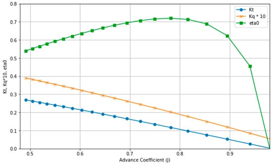 The forces and moments produced by the propeller are expressed in the most fundamental form in terms of a series of non-dimensional characteristics that are completely general for a specific geometric configuration [23]. The open-water test results for B-series propellers are conventionally presented in the form of thrust and torque coefficients (KT) and (KQ), expressed as functions of the advance coefficient. Expressions for the coefficients and efficiency are shown in Equations (4)–(7):