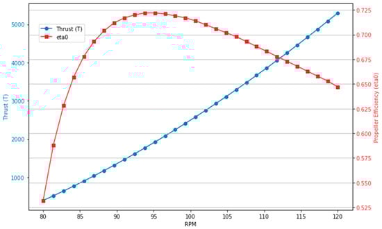 Once the initial T and Q are calculated, as shown in Equations (14) and (15), for all further (wind-assisted) operating points, the RPM calculator module iterates to find the RPM value corresponding to the desired thrust. When the thrust required from the propeller is known and the new RPM value is found, other propeller parameters are calculated including η0.