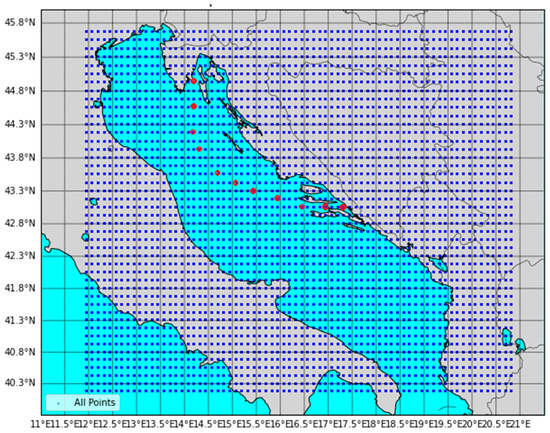 Weather data were obtained from Copernicus Marine Services for the year 2023. The historical data show hourly values for wind speed and direction 10 m above sea level. In Figure 5, a map of the Adriatic Sea is shown with the data points depicted; highlighted are the points of the route used in this study between two Croatian cargo ports, Rijeka and Ploče. In this stage of the research, the Adriatic Sea was set as the boundary in order to have a more efficient volume of data; the route itself was chosen as it covers a significant part of the Adriatic Sea. The waypoints were obtained by a chart-plotting software and then cross-referenced with the weather data points to find the closest match. The closest points are highlighted in red in Figure 5.