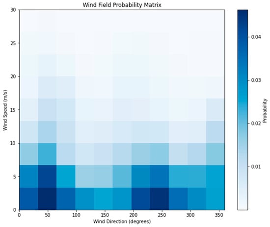 Wind speed/direction occurrence probability map of the area of interest for the year 2023.