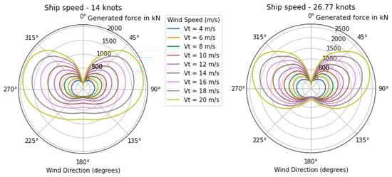Figure 7 shows two polar diagrams for different ship speeds; the sail force generated from the sails is illustrated under different wind conditions. The radial axis (extending outward from the center) represents the magnitude of the sail force in kN, the angular axis represents the true wind direction (βt), and the curved lines correspond to different wind speeds as indicated on the legend. From the shape of the curves and scale of the values, the influence of the wind speed, ship speed and wind direction can be observed.