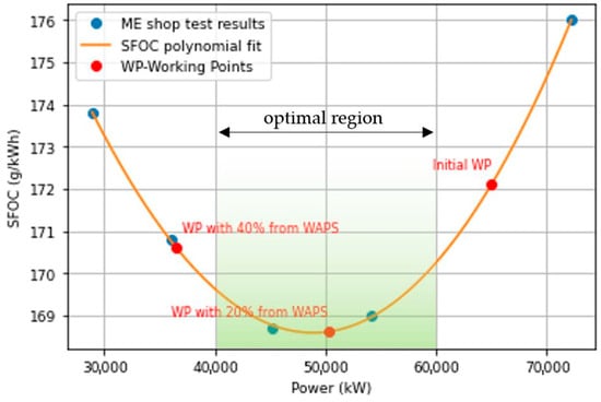 The aim of this analysis was propulsion power prediction at constant speed with regard to WAPS impact on the efficiency of the propeller and overall efficiency of WAPS. The results presented indeed confirm the shift in the operating point position along the propeller curve as the literature review indicated. However, in this case study, both the SFOC and propeller efficiency were improved when 20% and 40% thrusts were simulated from WAPS. In Figure 9, the SFOC map is presented based on the ME shop test results, showing the initial working point (WP) with an engine power of 65,041 kW at 109.5 RPM and a SFOC value of 172.11 g/kWh. Both wind-assisted points are below the initial operating point SFOC value, representing an increase in fuel efficiency. Still, other factors must be considered when discussing prolonged engine operation at reduced RPMs. These factors may include material wear, oil consumption, higher emissions, carbon build-up and vibrations resulting in possible maintenance costs. Engine performance while slow steaming should be considered, but it is a research task for itself. This paper will not cover the analysis of these aspects; the impact of reduced RPM operation on an engine is covered in [43,44,45].