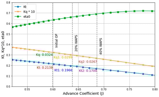 Kt, Kq and η0 curves vs. J for case study vessel.
