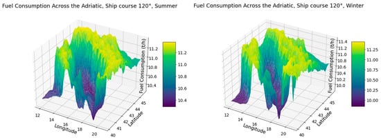 Using meteorological data from the Adriatic Sea, fuel oil savings were calculated for the case study vessel navigating eastbound on the presented route. Figure 11 illustrates a 3D map of fuel consumption, displaying the seasonal averages for summer and winter across all points within the study area (Figure 5). The diagram reveals that, from the initial average fuel consumption of approximately 11.2 t/h (without sails), significant reductions are achievable. In winter, an average savings of 1.4 t/h, or 12.5%, can be realized across the Adriatic Sea; this is calculated for the ship sailing eastbound with a course of 120°, with mean winter wind values for all points in the area. These data relate specifically to this ship, on this route, with this particular sail. Changing any of these parameters will alter the data. The analysis was conducted for conditions that might be referred to as the most common metocean conditions in the Adriatic in order to obtain a broader understanding of whether it is even possible to achieve the expected savings with this ship in the Adriatic. The data were obtained for a specific wind direction and speed (for each data point) averaged from all available values. These values actually represent what is the highest probability of occurrence for the Adriatic Sea. Naturally, the actual savings depend on the specific ship, location, WAPS technology and metocean conditions. The savings presented provide an order of magnitude estimate of the potential savings under specific conditions that represent typical seasonal conditions in the Adriatic.