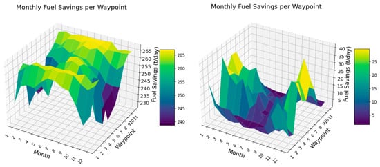 Figure 12 illustrates the average daily fuel consumption and potential fuel savings (in t/day) at waypoints along the case study route for 2023. The figure highlights fuel savings opportunities across the route throughout the year.