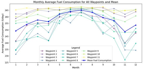 Monthly average fuel consumption (mean for all waypoints for Adriatic eastbound crossing).