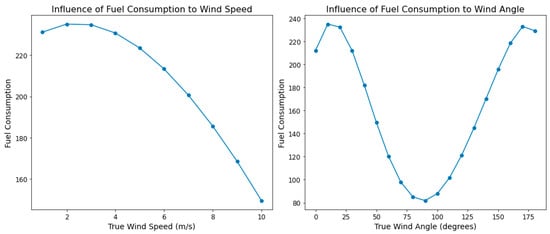 In Figure 14, the influence of a change in wind speed and wind direction on fuel consumption can be observed. The base line set points for the parameters are 18 m/s for Vt, 50° for βt and 26.8 knots for operational ship speed. The influence of the wind speed on fuel consumption, shown in Figure 14, is calculated with the wind angle fixed on the base line value, and vice versa.