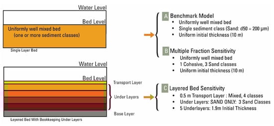 The second sensitivity case, “Underlayer, Four Class” (C in Figure 2) (referred to as “UL4C”), maintained the four sediment classes and overall initial thickness of SL4C. However, the configuration of the bed was altered to include a transport layer with underlayers. A 0.5 m transport layer was applied, and the remaining thickness was arbitrarily initially divided equally into two underlayers. The 6 μm mud class was only present in the transport layer. Only sand classes were initially in the underlayers. Each class contributed to the total thickness of each layer, as previously described. Where derived sediment classes were not present in the domain, the 200 μm sand class made up the entire initial thickness. The UL4C case was designed for evaluation of model sensitivity to bed configuration (i.e., limitation of fine sediments to the transport layer) and to highlight possible armoring effects of fine sediments by coarser sediments.
