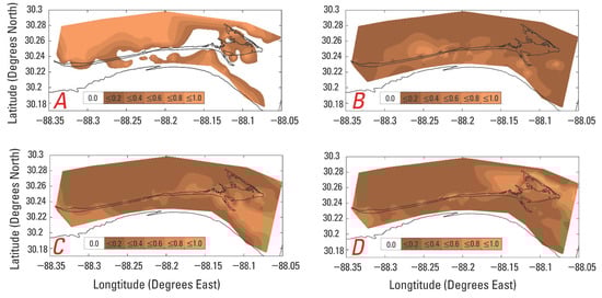 The left column of Figure 8 (panels A, B, and C) shows areas of morphological interest already highlighted by results presented in Section 3.2 and Section 3.3. Beginning with what does not vary between the sensitivity cases, there is no evolution in any case along the back-barrier shoreline (coincident with and Figure 5A–C). This lack of change on the back barrier shoreline is to be expected, as the probabilistic runs contain no storms or wind forcing needed to induce overtopping or to intensify wave activity in Mississippi Sound and redistribute back-barrier sediments [38,41].
