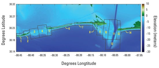 - Flocks, J.G.; DeWitt, N.T.; Stalk, C.A. Analysis of Seafloor Change around Dauphin Island, Alabama, 1987–2015; US Geological Survey: Reston, VA, USA, 2017; p. 26. [Google Scholar]