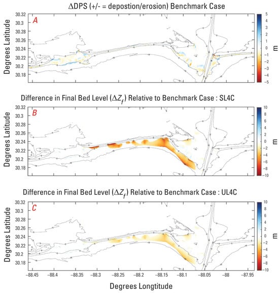 for the benchmark case showed a general range of ±2 m, with the areas of greatest morphological activity confined mainly to the Ebb-Tidal Shoal outside the mouth of Mobile Bay and in Petit Bois Pass, attributable to tidal velocities [43] through these channels. There was also significant morphological activity on the eastern flank of the deep channel through Main Pass and around the western terminus of Fort Morgan peninsula, where (ebb) tidal velocities are also significant [43] (; Figure 5A). Further, there are patterns of deposition and erosion in the nearshore surf zone of both Petit Bois Island and Fort Morgan Peninsula with range of ±1 m. In the nearshore region of Dauphin Island, there is also a general alongshore alternating pattern of deposition and erosion () attributable to wave action and alongshore transport [50,52]. Deposition is greatest on the westward side of Pelican Island, the Dauphin Island shoreline immediately adjoining Pelican Island, on the foreshore of Katrina Cut, and the foreshore of Dauphin Island’s western terminus (though the very tip of the western terminus is eroded).