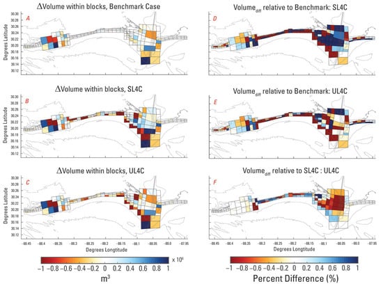 For both SL4C and UL4C, there is significant negative (erosional) throughout region 6, with a greater magnitude of erosion occurring in the single-layer case. The adjoining blocks of region 6 and region 7 (immediate area of Katrina Cut; Figure 6A) show positive for the Benchmark case, while the same blocks show positive and negative in Figure 6B,C, respectively. The magnitude of deposition in the westernmost blocks of region 7 is also increased in SL4C (6B) and UL4C (6C) relative to the Benchmark (6A), with the greatest positive occurring in SL4C in region 7 ( relative to Benchmark, UL4C relative to SL4C; Figure 6D and Figure 6F, respectively).