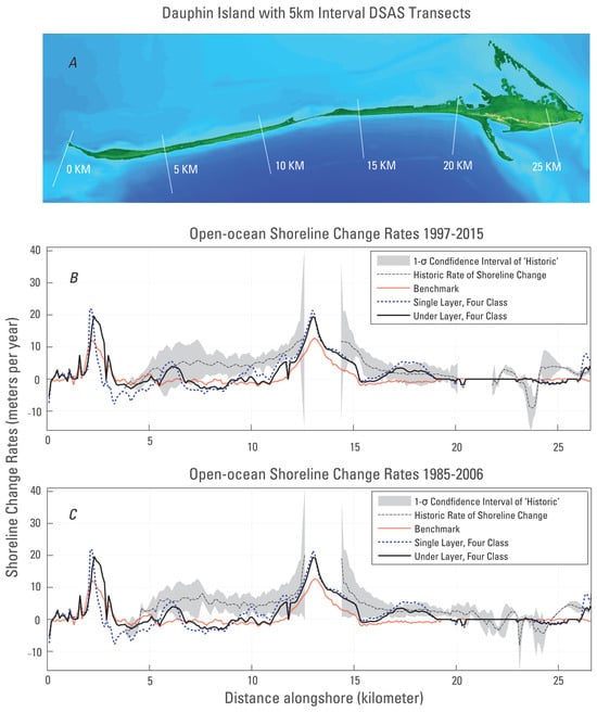 The historical LRR (dashed black line) [51] and confidence interval plotted as gray shaded areas establish for both periods a northward migration of the shoreline on the western half of Dauphin Island (5 to 12 km alongshore) at a rate of approximately 5 m per year (m/yr) to greater than 10 m/yr. Northward migration rates of the open-ocean shoreline are similar farther alongshore (14 to 20 km) decreasing in magnitude as eastward distance alongshore increases. In both historical periods, southward migration of the shoreline (negative LRR) is only present at points toward the eastern end of the island between 20 km and 25 km alongshore. Both periods also display a southward migration of the shoreline on transects 4 km to 5 km alongshore.