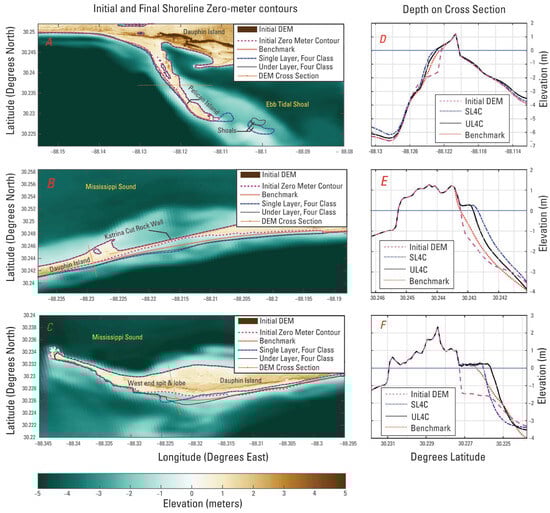 Maps of initial island elevation (color bar) in meters (m) for three areas of interest (A–C) with associated depth cross section (D–F). The initial model shoreline (dashed pink line) and final model shorelines produced by each sensitivity case (Benchmark case: red dotted line; Single Layer, Four-Class case: blue dashed line; Underlayer, Four-Class case: solid black line). The locations of depth cross sections (D–F) are shown in each map figure (A–C) by an orange line marked with a “”. At Pelican Island (A,D), both of the sensitivity cases with multiple sediment classes produced greater accretion at the shoreline (A) and the subaqueous nearshore than the Benchmark case. At the Katrina Cut region (B,E) shoreline accretion progradation and a building out of the nearshore region relative to the benchmark is also notable. In the area of the West End Spit (C,F), the cases with multiple sediment classes again show increased progradation of the shoreline, broadly, in a non-uniform manner.
