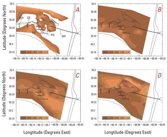 Validation of model hydrodynamics was carried out using a deterministic configuration of the P-J model for several time periods using time-series boundary conditions for waves and water levels. Passeri et al. [40] conducted assessments of P-J model skill by comparing observed and modeled water velocities, volumetric fluxes, water levels, and bed-level changes. Modeled water velocities were compared to shipboard acoustic Doppler current profiler (ADCP) water velocity observations through Mobile Bay inlet (Main Pass). The R2 values for the modeled and observed U velocities (through channel) during ebb and flood tide were 0.93 and 0.66, respectively. The R2 values for the modeled and observed V velocities (cross channel) during ebb and flood tide were 0.79 and 0.30, respectively. Fluxes (observed and modeled) were defined as stream-wise, depth-averaged velocities multiplied by water depth and integrated over the observation transect. A linear fit and R2 value were calculated for the ebb and flood tide fluxes, resulting in values of 0.98 and 0.79, respectively. Passeri et al. [40] demonstrated high model skill in capturing the ebb-dominant behavior of the inlet, which affects sediment transport out of the bay. The R2 value between the observed and modeled water levels was 0.68. The error in the modeled water level was attributed in part to the absence of lower-frequency harmonic constituents in the boundary forcing [41]. Jenkins et al. [41] assessed P-J model skill by comparison between observed and modeled wave heights, reporting underprediction of mean significant wave heights of 3 to 8 percent.
