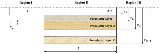 Consider a cylindrical silencer with layers of poroelastic material arranged in a cylindrical duct of length , as shown in Figure 1. At the center is air with an average flow rate of zero. From the center, the distance to the first poroelastic material is called ; the distance to the second poroelastic material is called ; the distance to -th poroelastic material is called , and the distance to the wall of the silencer is called .