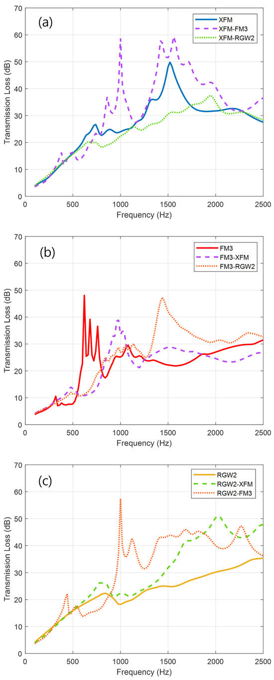 For Figure 4a,b, there is no noticeable difference compared to the double layer. However, a strong resonance around 1800 Hz is found in the XFM-RGW2-FM3 arrangement, and strong peaks around 1500 Hz and 2050 Hz are found in the FM3-XFM-RGW2 arrangement. Noteworthy is the characterization of the RGW2-XFM-FM3 arrangement shown in Figure 4c. A strong resonance characteristic appears around 1230 Hz and 1800 Hz, especially around 1800 Hz, where a very large TL of more than 70 dB is predicted to be obtained.