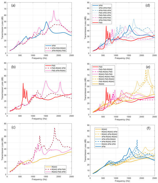 TL of a silencer composed of triple-layer poroelastic materials. Triple-layered with completely different materials: (a) XFM; (b) FM3; and (c) RGW2 on the inner layer, respectively. A combination of (d) XFM-FM3, (e) FM3-RGW2, and (f) RGW2-XFM, respectively.