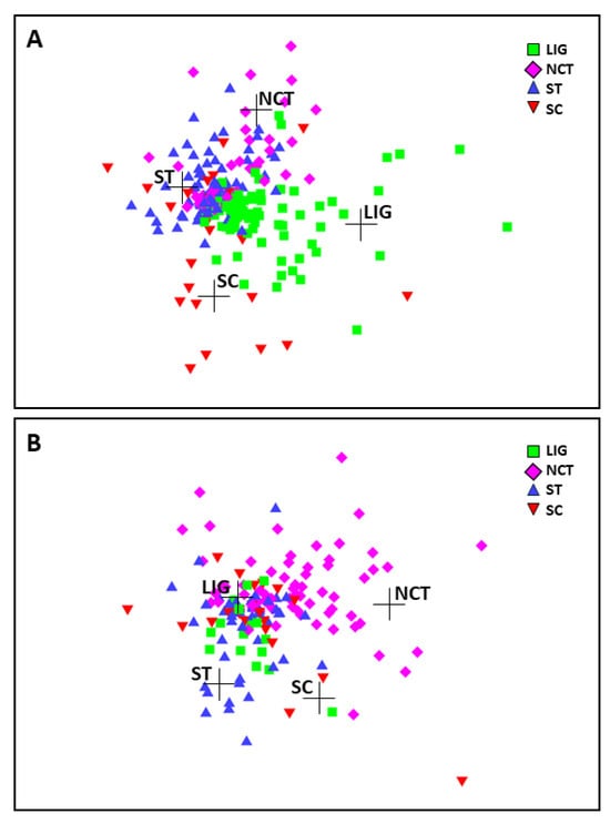 Non-metric Multi-Dimensional Scaling (nMDS) plots for the (A) upper (<100 m) and (B) lower (>100 m) mesophotic zone. Bray–Curtis similarity Index; Shepard plot stress plots: 0.015. LIG, Ligurian Sea; NCT, North–central Tyrrhenian Sea; ST, South Tyrrhenian Sea; SC, Sicily Channel.