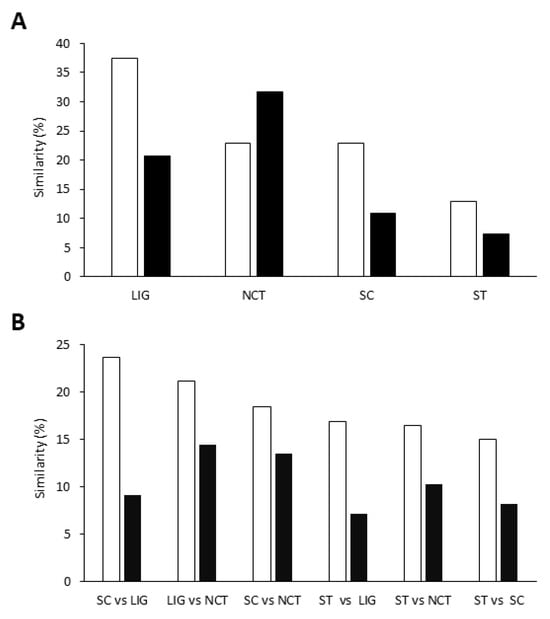 (A) Similarity percentage of each macro-area, and (B) pair-wise comparisons among macro-areas. White bars, upper (<100 m) mesophotic zone; black bars, lower (>100 m) mesophotic zone. LIG, Ligurian Sea; NCT, North–central Tyrrhenian Sea; ST, South Tyrrhenian Sea; SC, Sicily Channel.