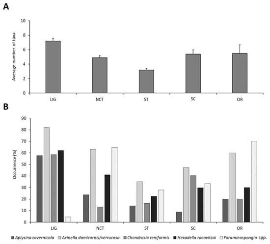 (A) Average number of sponge taxa (± SE) in each site in the five considered macro-areas, and (B) percentage frequency of occurrence of the five target sponge taxa in each macro-area. Legend: LIG, Ligurian Sea; NCT, North–central Tyrrhenian Sea; ST, South Tyrrhenian Sea, SC, Sicily Channel; OR, offshore reliefs.