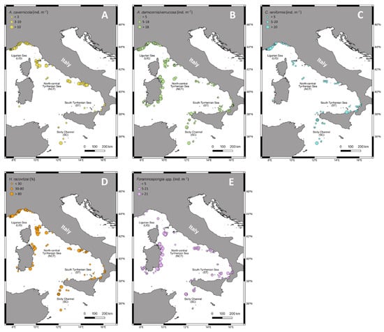 Considering the large-scale distribution of these taxa, four showed a pattern similar to that observed for the overall spongofauna, with a maximum in the Ligurian Sea (82% of the sites for A. damicornis/verrucosa and about 60% of the sites for the other taxa) and a progressive decrease moving southward in the Tyrrhenian Sea, with percentages of occurrence between 14% and 35% (Figure 3B and Figure 4A–D). A second minor peak of occurrence in the Sicily Channel was reported for A. damicornis/verrucosa, C. reniformis, and H. racovitzai but not for A. cavernicola, which was present in only five sites in this macro-area (Figure 3B and Figure 4A–D). In the North–central Tyrrhenian macro-area, all four taxa were observed in the Tuscan and Pontine archipelagos, sometimes with high abundances; on the other hand, along the eastern Sardinian coast, only A. damicornis/verrucosa and H. racovitzai were noted, while A. cavernicola and C. reniformis were virtually absent (Figure 4A–D).
