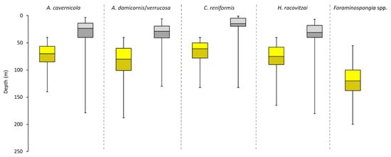 Regarding the bathymetric distribution of these taxa, the recorded depth ranges were 40–140 m for A. cavernicola, 40–188 m for Axinella damicornis/verrucosa, 40–132 m for C. reniformis, 40–165 m for H. racovitzai, and 55–200 m for Foraminospongia spp. (Figure 5). The distribution medians from the literature of the four species were between 15 and 31 m, with the quartiles extending to the upper limit of the mesophotic zone (40 m). In the present dataset, the highest occurrence was observed between 70 and 80 m for A. cavernicola, Axinella damicornis/verrucosa, and H. racovitzai, and around 60 m for C. reniformis (Figure 5). Since Foraminospongia spp. was identified only at the genus level, no comparison could be made for this taxon (Figure 5).