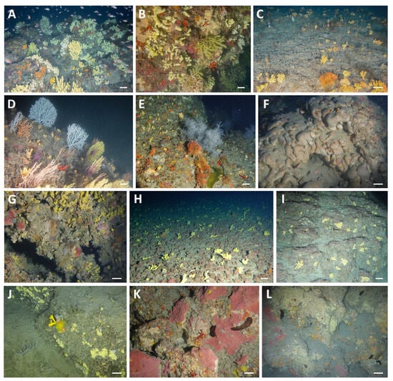Aggregations of the five target taxa in different habitats: (A) numerous colonies of Aplysina cavernicola on the coralligenous outcrops in Diano Marina (western Ligurian Sea, 55 m); (B) A. cavernicola and Hexadella racovitzai dominating the basal layer of the facies with Alcyonacea on Ischia Island (South Tyrrhenian Sea, 75 m); (C) dense aggregation of Axinella damicornis/verrucosa on the detritic bottom of Santo Stefano (western Ligurian Sea, 50 m); (D,E) numerous individuals of A. damicornis/verrucosa beneath gorgonian and black coral forests, respectively (Bordighera Canyon, western Ligurian Sea, 75 m; Favazzina, South Tyrrhenian Sea, 85 m); (F) the densest aggregation of Chondrosia reniformis observed in the present study on the circalittoral coralligenous outcrops in the Gulf of Gioiosa (South Tyrrhenian Sea, 78 m); (G) A. cavernicola and C. reniformis together with other benthic organisms completely covering an iron shipwreck in Lampedusa (Sicily Channel, 65 m); (H) Foraminospongia spp. on a rhodolith bed in Porto Corallo (North–central Tyrrhenian Sea, 125 m); (I) dense aggregation of Foraminospongia spp. on coralligenous accretions in the Pontine Archipelago (North–central Tyrrhenian Sea, 105 m); (J) numerous specimens of Foraminospongia spp. together with structuring anthozoans on the offshore circalittoral rocks off Orosei Canyon (North–central Tyrrhenian Sea, 170 m); (K) bright reddish patches of H. racovitzai on a coralligenous cliff of Elba Island (North–central Tyrrhenian Sea, 85 m); (L) the silted deep banks of Santo Stefano covered by contracted H. racovitzai (western Ligurian Sea, 90 m). Scale bar: 10 cm.
