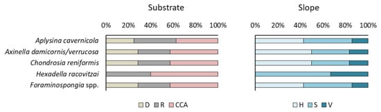 Percentage preference for the considered types of substrates (left) and slope (right) of the target taxa. Substrate categories’ codes: D, detritic including rhodoliths; R, outcropping or sub-outcropping rocks; CCA, rocks covered by crustose coralline algae. Inclination category codes: H, horizontal or sub-horizontal; S, sloping; V, vertical or sub-vertical.